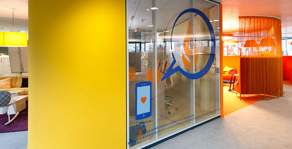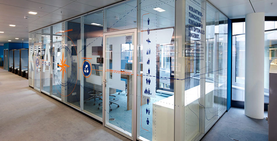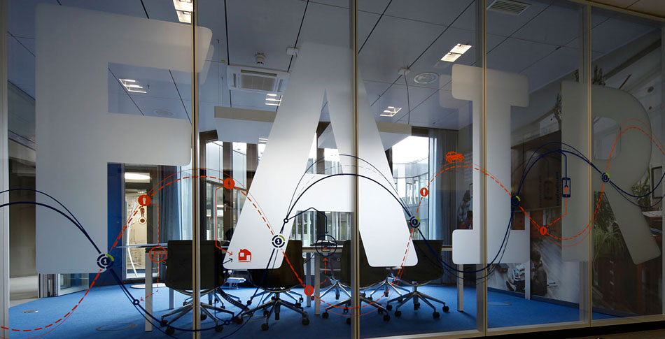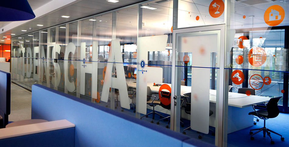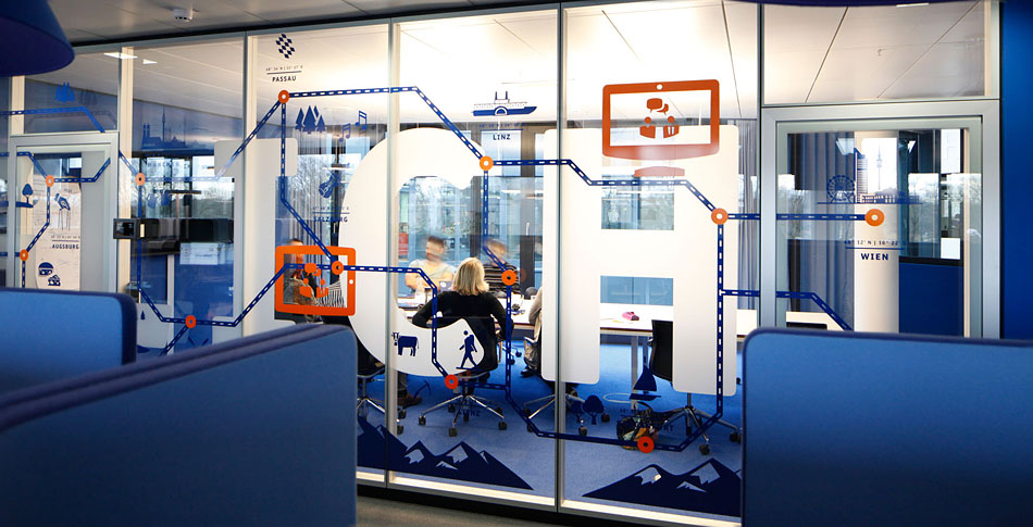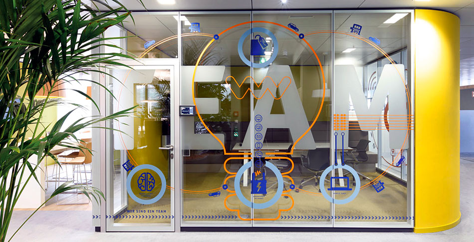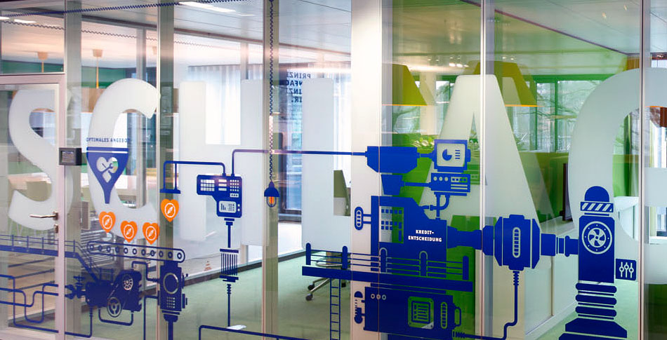 Mit der Gestaltung und Umsetzung des Parkhauses, der Raumbespielung sowie des hausinternen Leitsystems, landeten mehrere aufregende und herausfordernde Projekte auf unserem Schreibtisch. Ziel der Gestaltung war es, nicht nur der offenen, transparenten Bauweise des modernen Gebäudes Rechnung zu tragen, sondern auch den Markenkern Fairness der TeamBank AG auf ganz besondere Art und Weise zu integrieren. Auch die genossenschaftlichen Markenwerte wie Nähe, Transparenz und Kommunikation auf Augenhöhe sollten täglich visuell erlebbar gemacht werden.