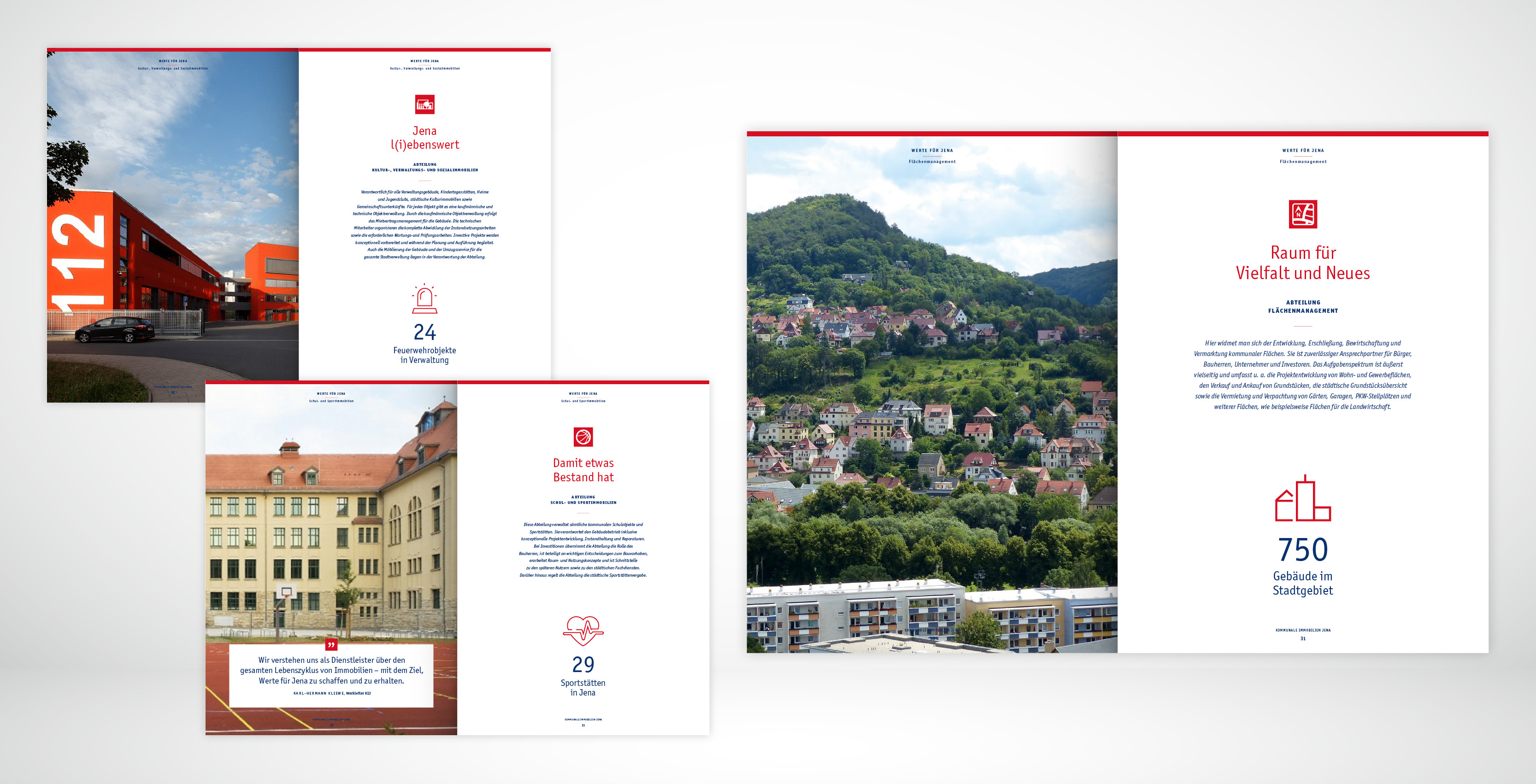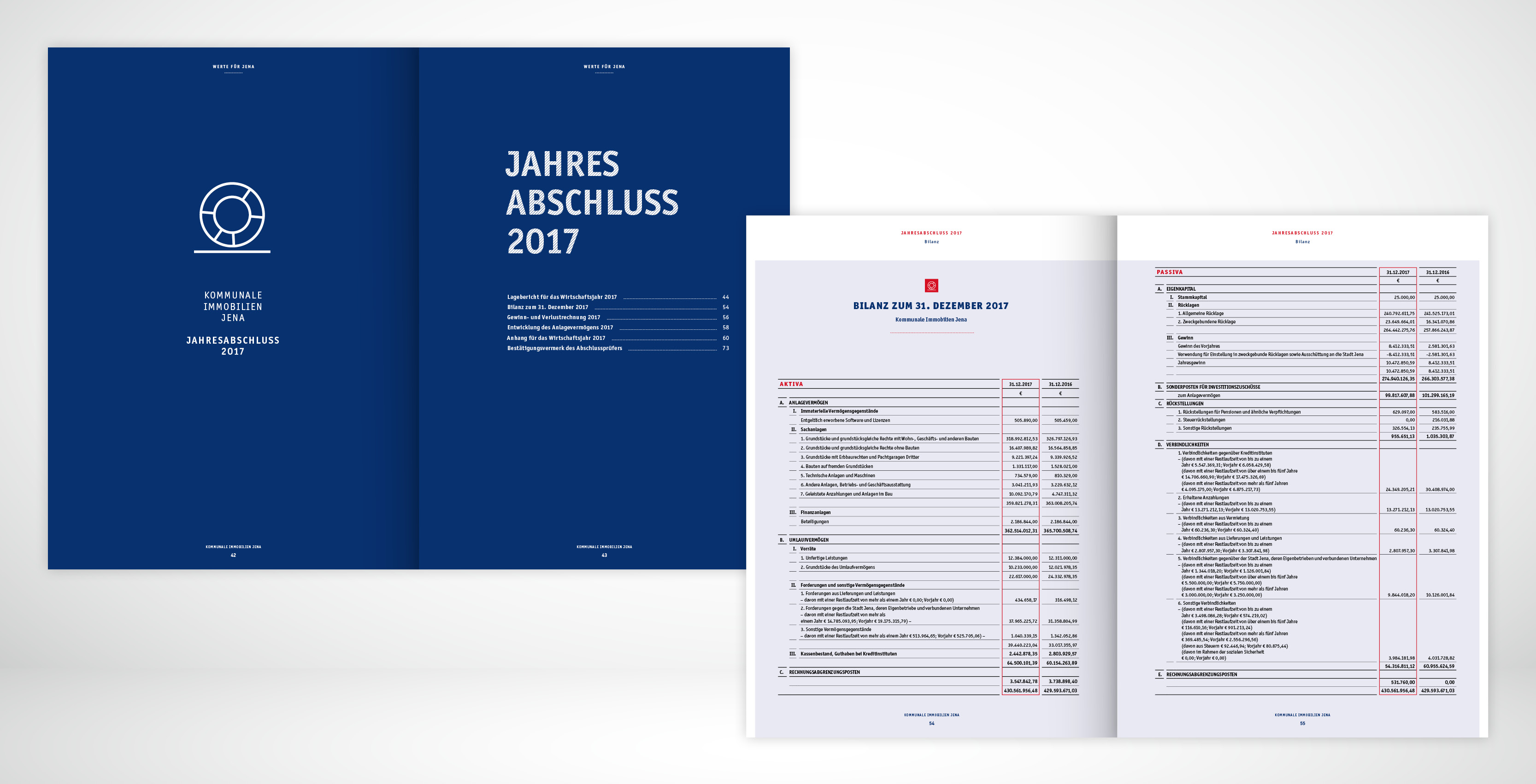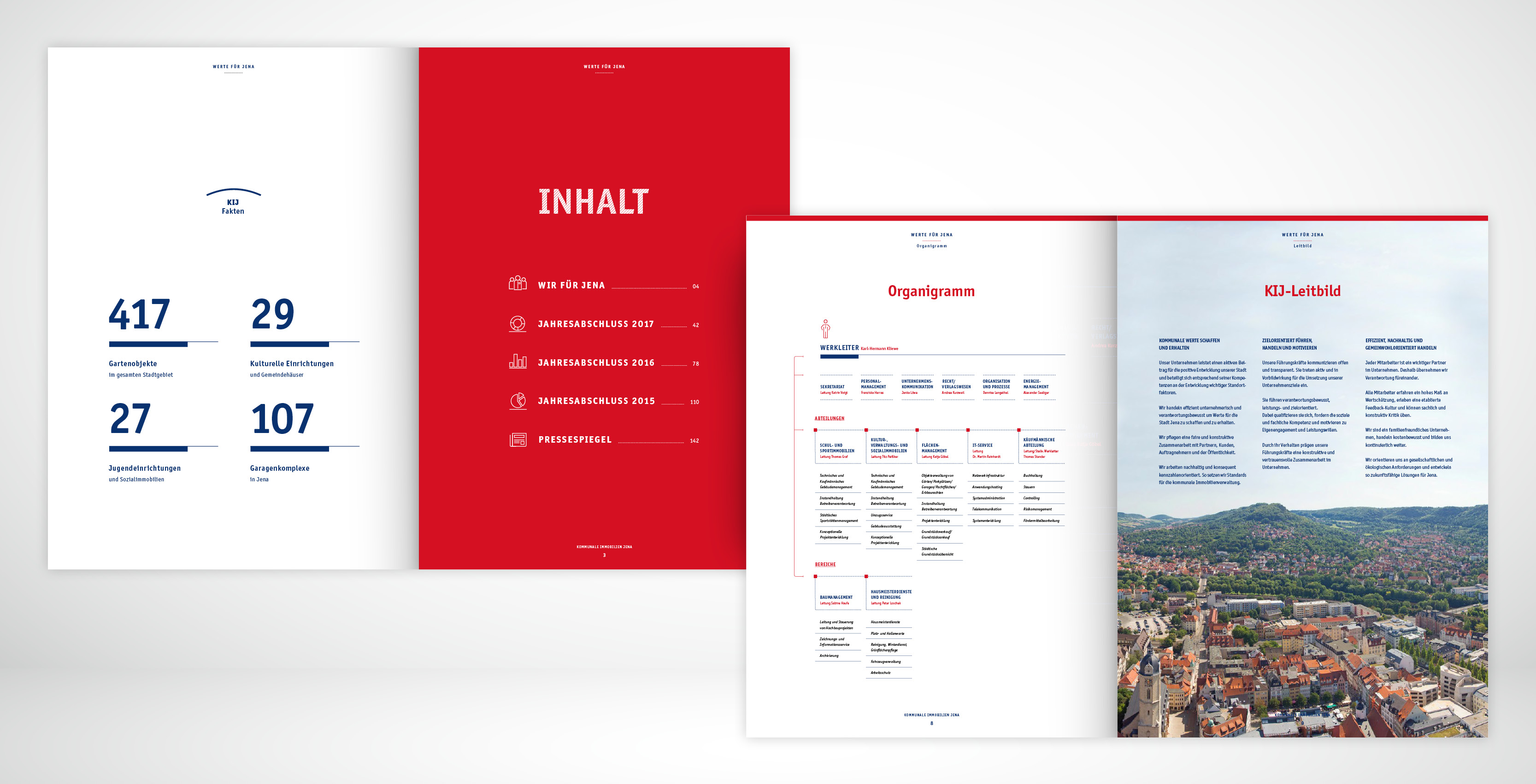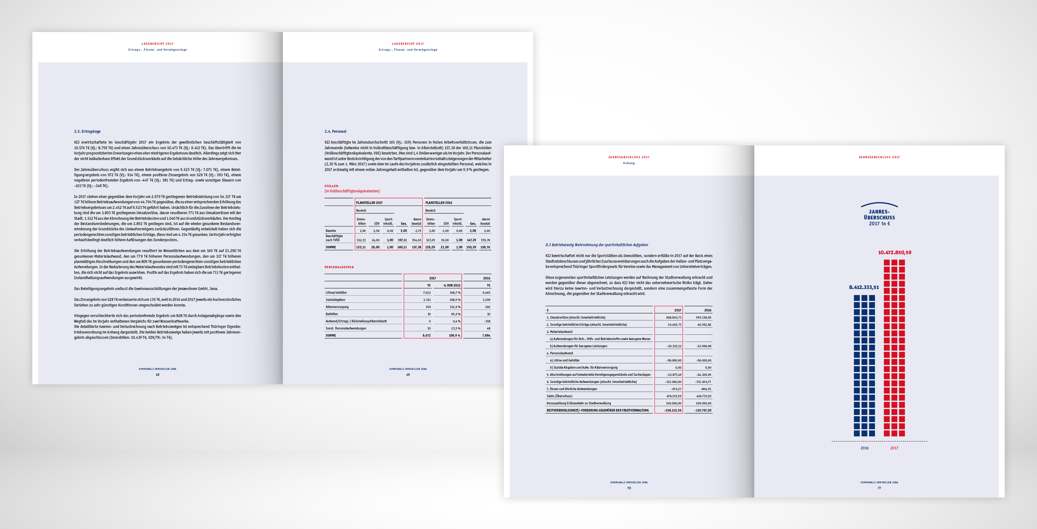 Der Geschäftsbericht ist für die Kommunale Immobilien Jena mittlerweile ein wichtiges Kommunikationsinstrument. Schließlich erreicht man damit wichtige Entscheider, Investoren und potentielle Geschäftspartner. Wir wissen um die Chance, per Business Report nicht nur nüchterne Fakten zu vermelden, sondern auch Image zu transportieren. Der Mehrwert eines gestalteten Geschäftsberichtes, liegt in der Visualisierung der Unternehmenszahlen. In der optischen Aufarbeitung von Emotion und Information.